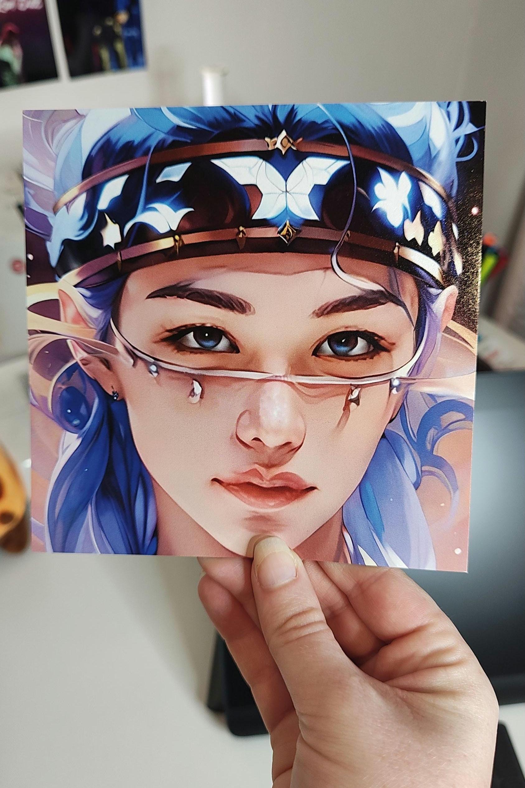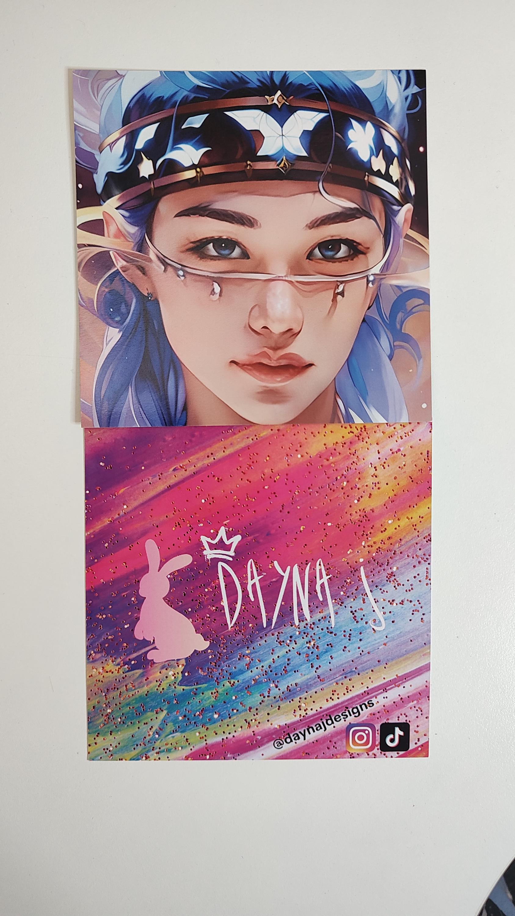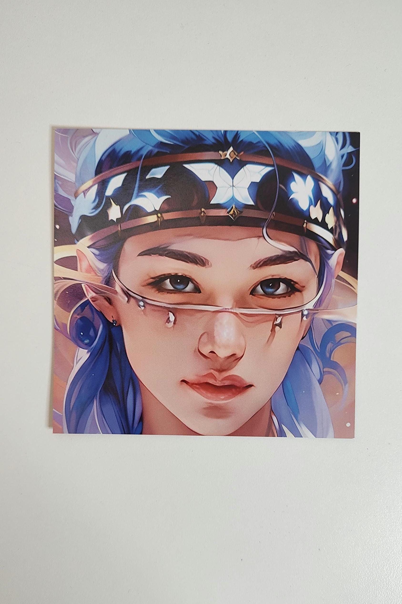 Created artwork via Adobe suite, hand-drawn on a device/digitally painted by me. This is a square card print, dimensions are 14 x 14 cm. Printed on glossy deluxe card front and back.