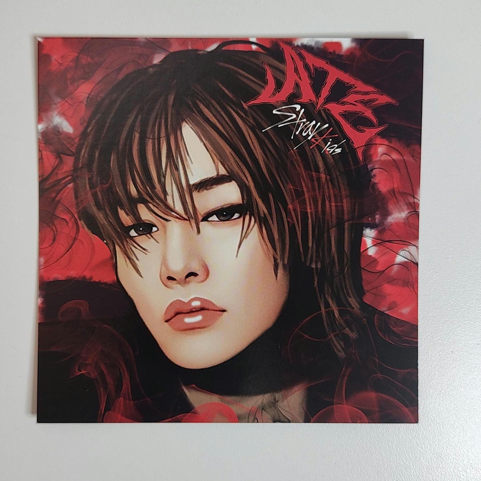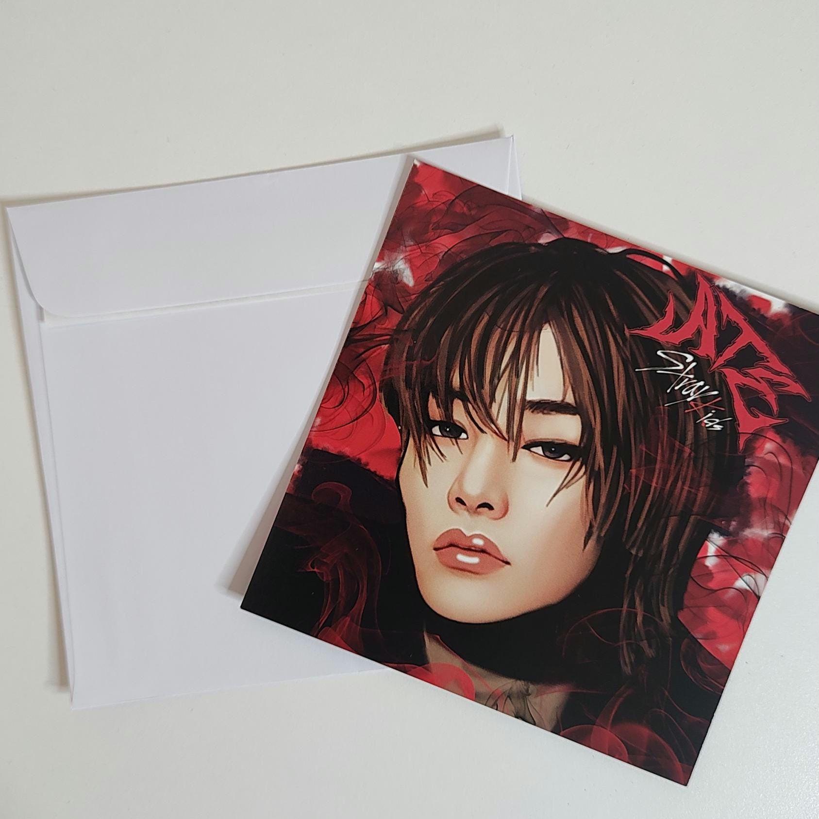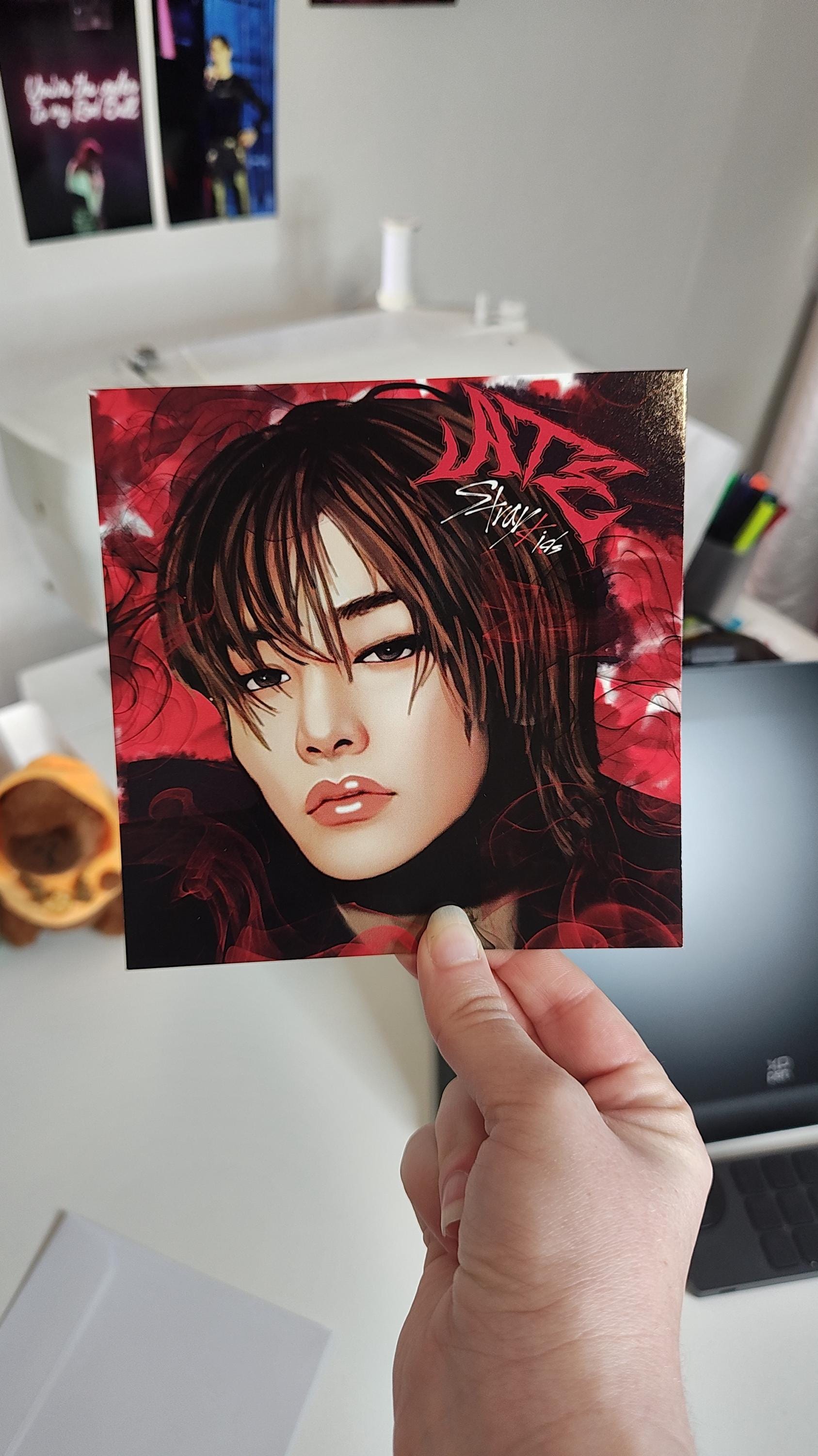 Created artwork via Adobe suite, hand-drawn/digitally painted by me. This is a square card print, dimensions are 14 x 14 cm. Printed on high gloss deluxe card front and back. This one is of I.N from Stray Kids, ATE concept, decorated in Skz colours.