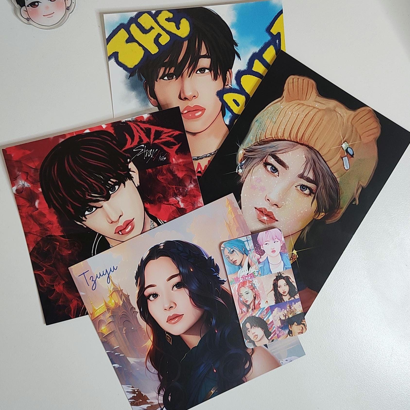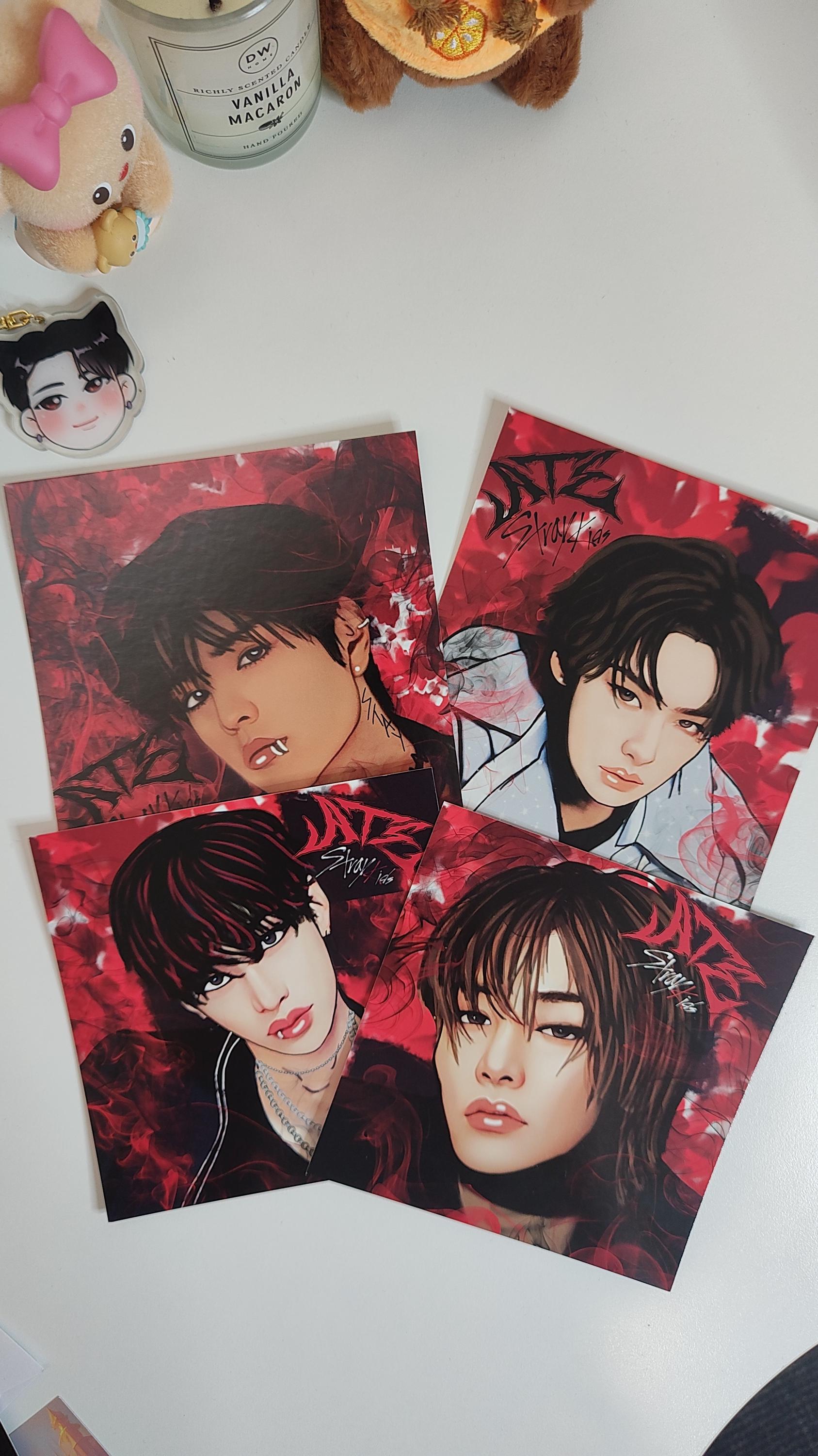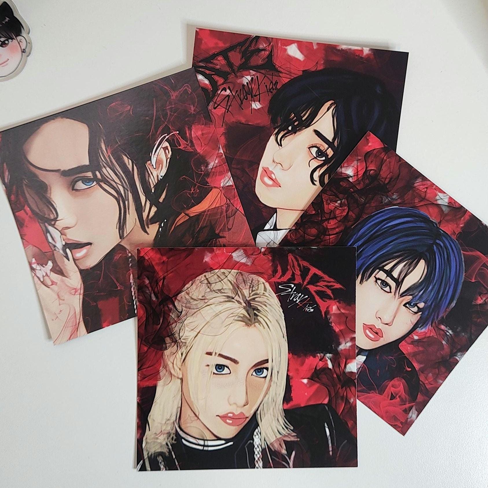 Created artwork via Adobe suite, hand-drawn/digitally painted by me. This is a square card print, dimensions are 14 x 14 cm. Printed on high gloss deluxe card front and back. This one is of I.N from Stray Kids, ATE concept, decorated in Skz colours.