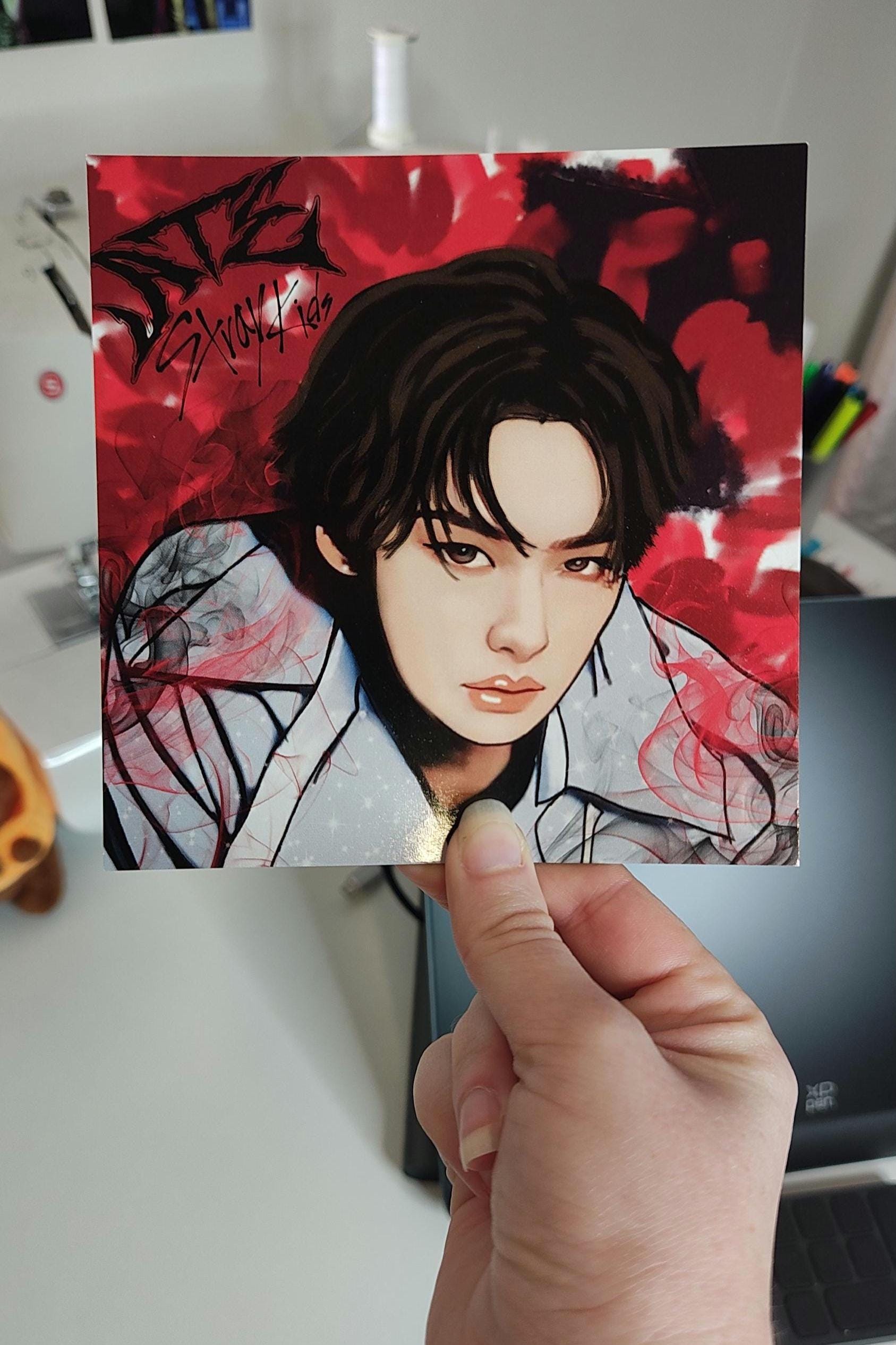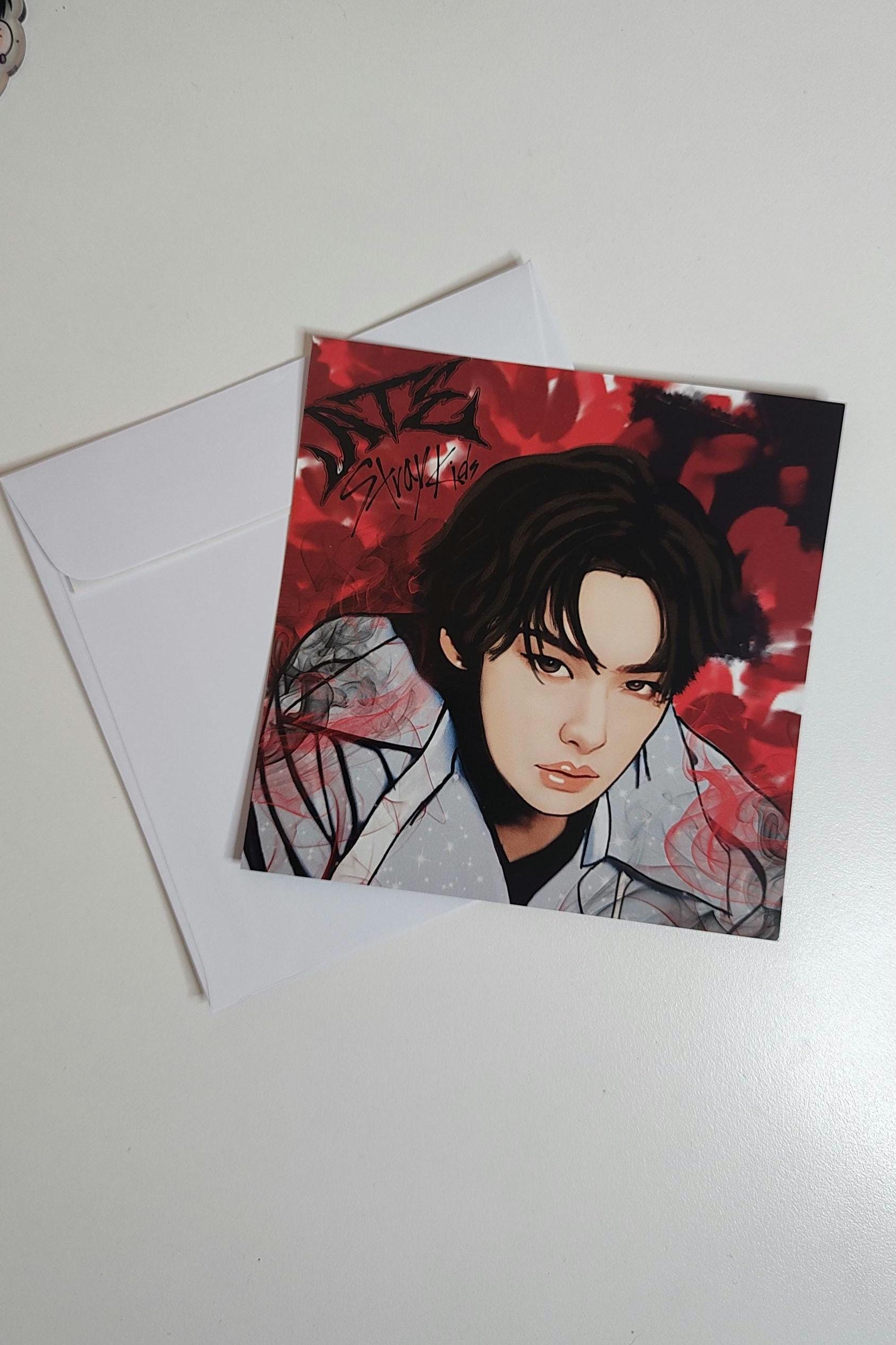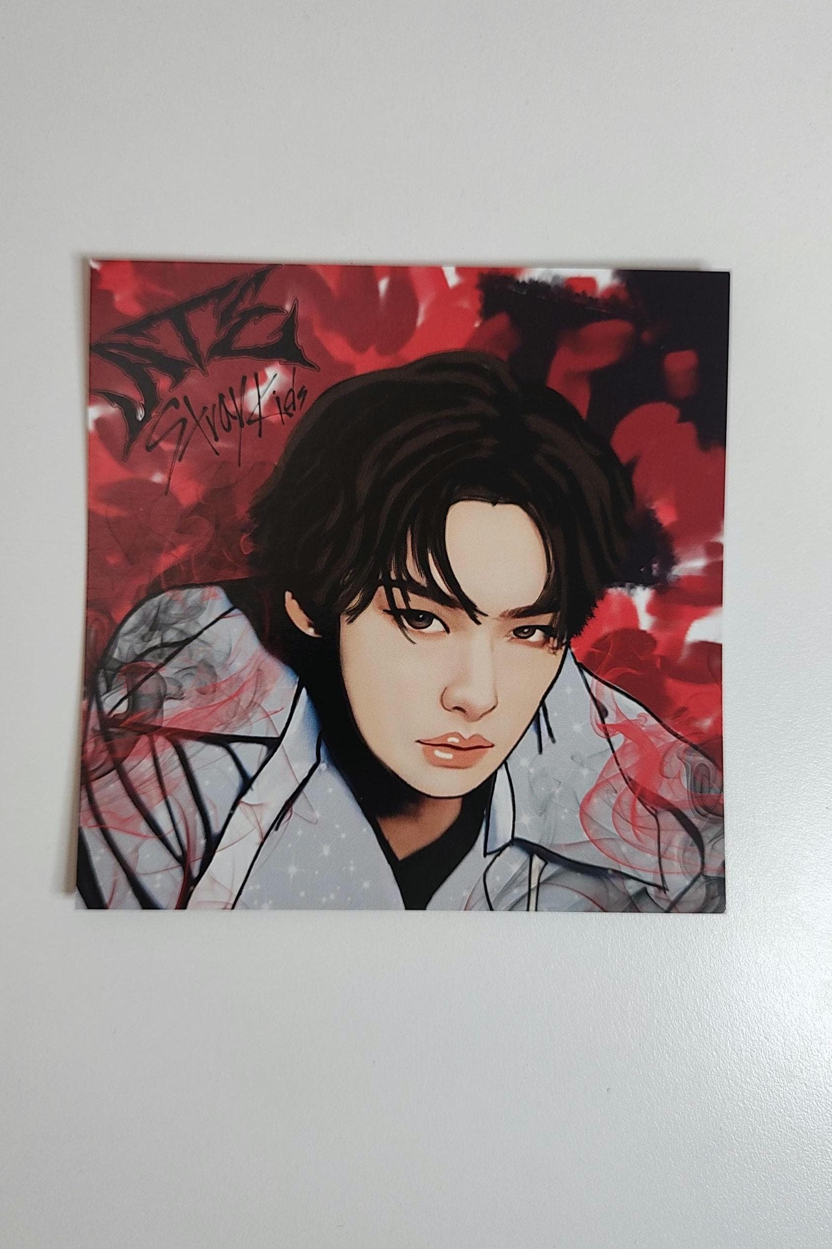 Created artwork via Adobe suite, hand-drawn/digitally painted by me. This is a square card print, dimensions are 14 x 14 cm. Printed on high gloss deluxe card front and back. This one is of Lee Know from Stray Kids, ATE concept, decorated in Skz colours.
