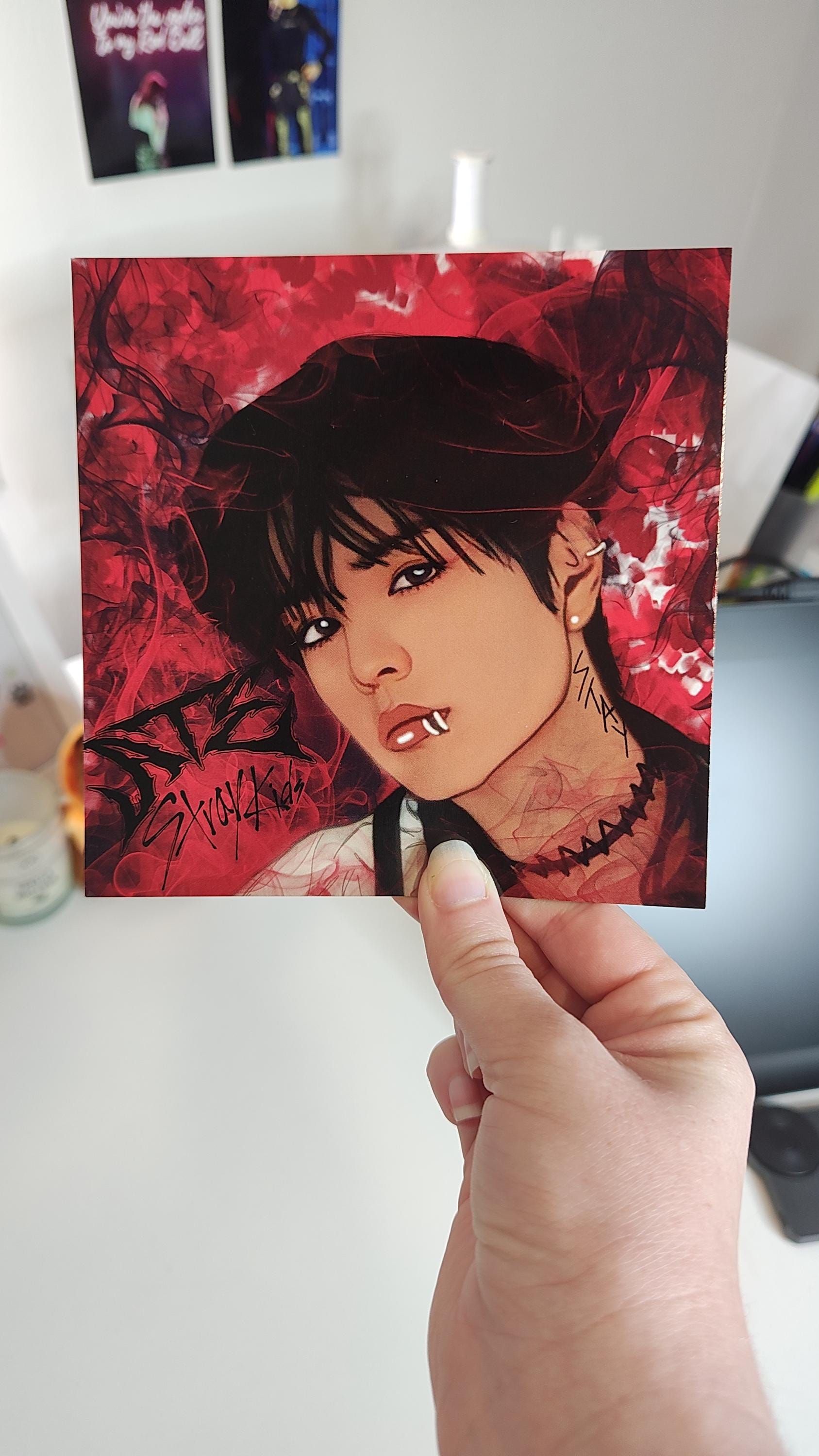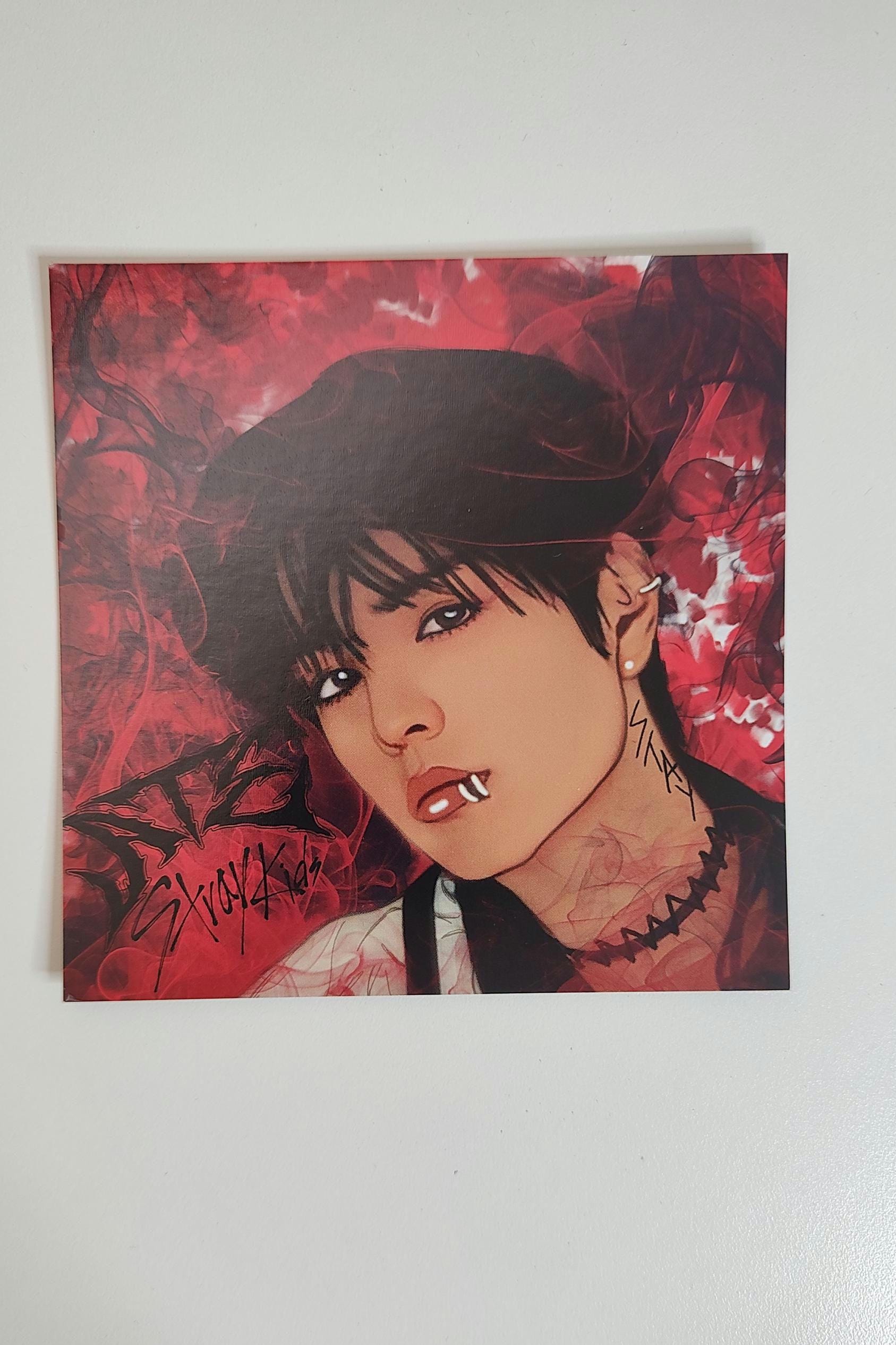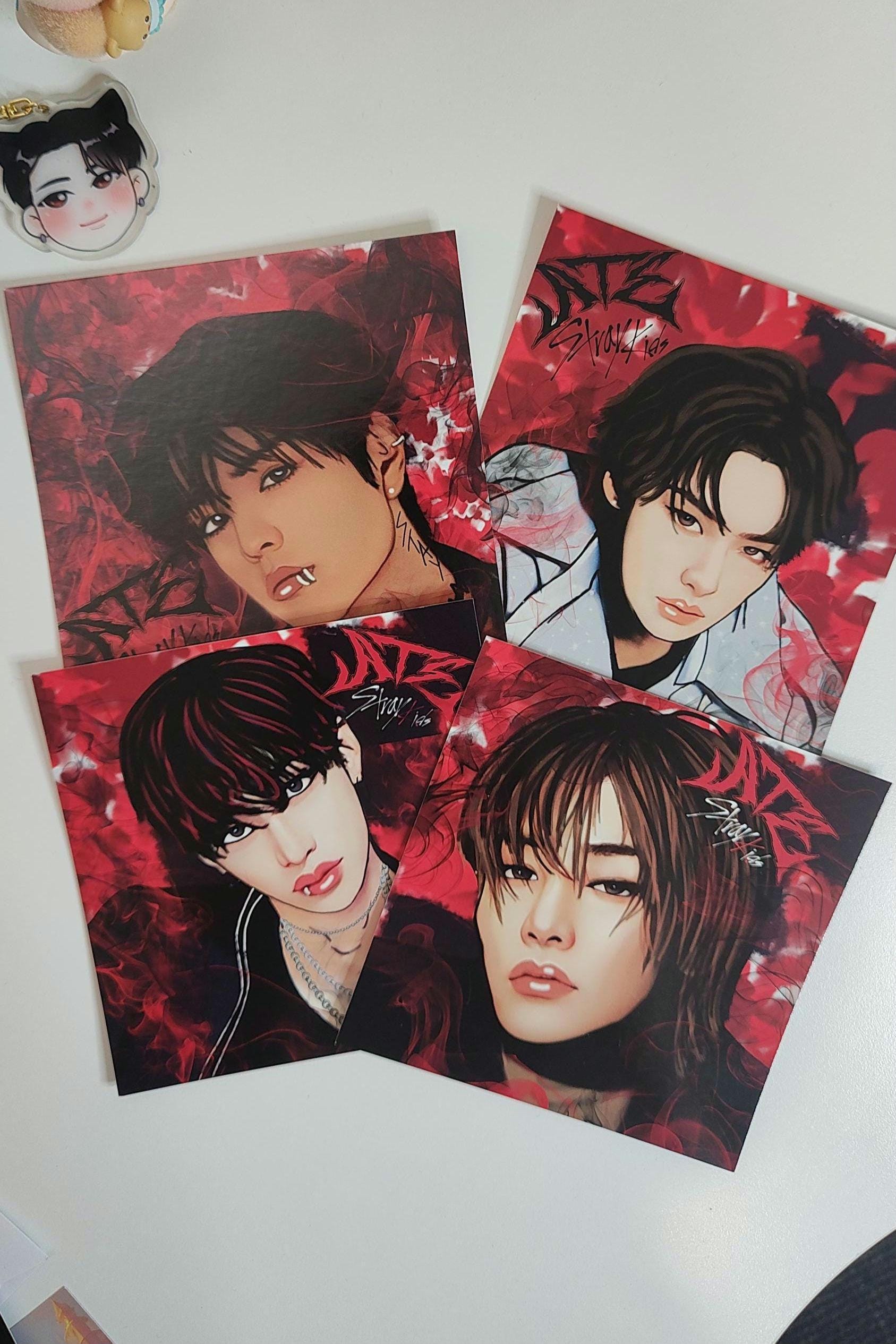 Created artwork via Adobe suite, hand-drawn/digitally painted by me. This is a square card print, dimensions are 14 x 14 cm. Printed on high gloss deluxe card front and back. This one is of Seungmin from Stray Kids, ATE concept, decorated in Skz fandom colours.